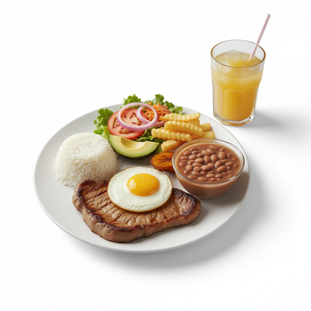 Ingredientes: Arroz, papas a la francesa, maduro, aguacate, frijoles, huevo frito, ensalada, jugo del día, proteína (a elección)